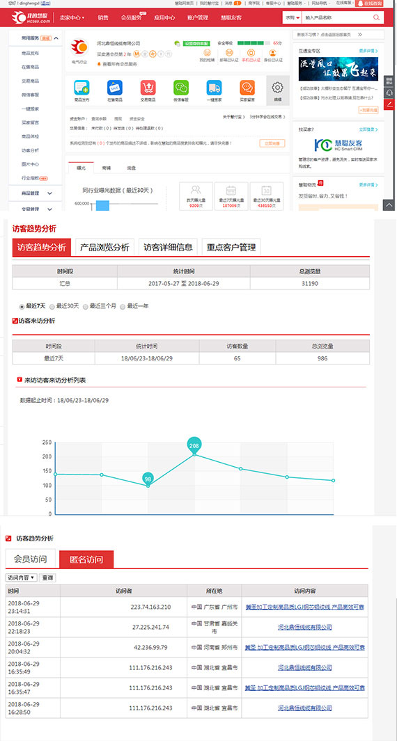 商铺后台展示:曝光量 展现量 访客分析 留言管理 客服设置 产品编辑 产品编辑